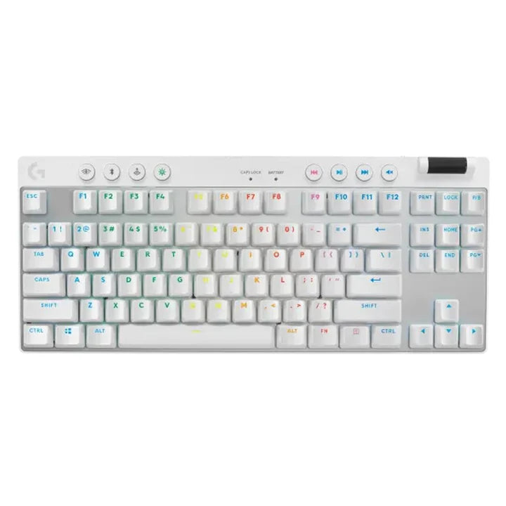 لوحة مفاتيح الألعاب اللاسلكية Logitech G PRO X TKL LIGHTSPEED - باللون الأبيض مثالية للاعبين الذين يحتاجون إلى لوحة مفاتيح محمولة وعالية الأداء توفر الدقة والسرعة والميزات القابلة للتخصيص. حجمها الصغير واتصالها اللاسلكي الموثوق يجعلانها خيارًا مثاليًا لكل من لاعبي الرياضات الإلكترونية واللاعبين العاديين على حد سواء، كل ذلك مع توفير مظهر أنيق ونظيف باللون الأبيض.