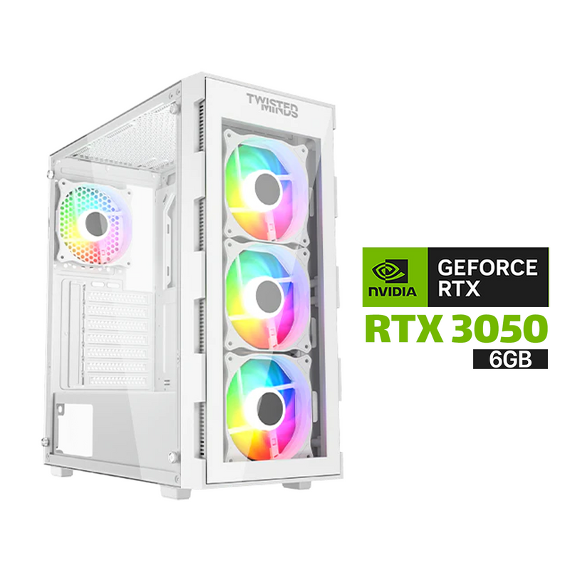 | Model | Gaming PC i5-12400F CPU, H610 DDR4 Motherboard, 16GB DDR4 RAM, 1TB NVMe SSD, 650 WATT PSU, RTX 3050 6GB VGA, Twisted Minds Titan Mid-Tower Case white With 4x RGB Fans, USB Wi-Fi Adapter, Windows 11 Pro License |