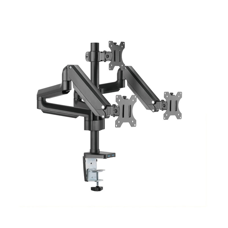 The Twisted Minds Premium Triple Monitor Arm is the perfect solution for users seeking a versatile and space-saving monitor setup. Designed to accommodate three monitors ranging from 17″ to 27″, this arm allows for optimal screen positioning, providing comfort and enhancing productivity. With its built-in USB ports, it offers added convenience for quick access to USB devices, making it an ideal choice for both work and gaming setups.