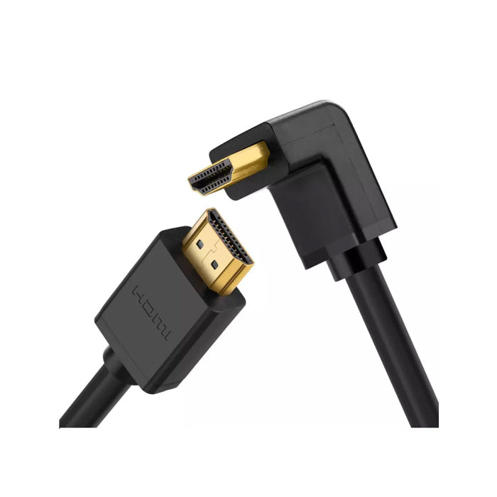 The cable features a 90-degree angle on both ends, making it ideal for tight spaces, wall-mounted TVs, or any setup where a straight cable would be difficult to manage or connect.