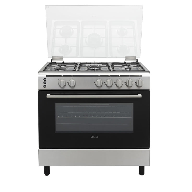 The Vestel Gas Cooker 90x60, 5 Burners, Stainless Steel, Full Safety is a premium kitchen appliance that combines functionality, safety, and modern design. With five powerful gas burners, full safety features, and a durable stainless steel finish, this cooker ensures a reliable cooking experience while enhancing the look of your kitchen.
